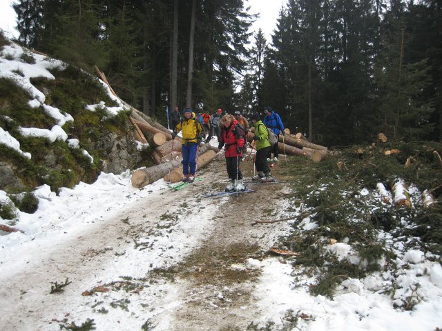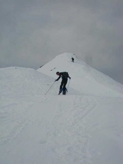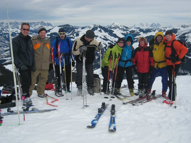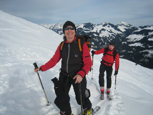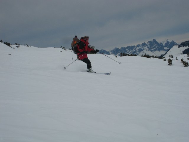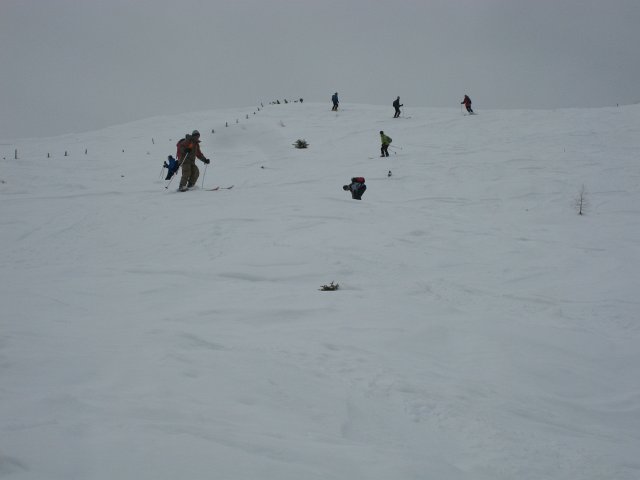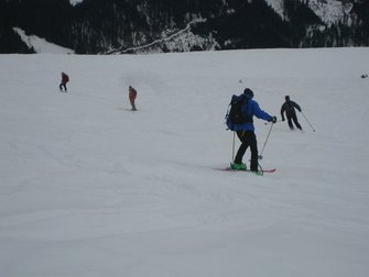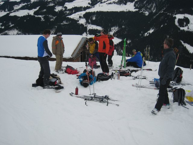 Die Abfahrt: der obere Teil hat allen sichtlich Spass gemacht: auf den schönen offenen Hängen war noch 10cm Pulver auf Altschnee zu finden. Im Mittelteil wars dann recht ausgefahren, aber dadurch ganz ordentlich zu fahren. Dazu gabs Freeride-Tipps vom Toschi (DSV-Skilehrer von den Forstenriedern). Und zum Schluss dann ein Forststrassendownhill bis zum Parkplatz - der Peter mit seinen Zahnstocher-Kästle-Rennski aus dem Jahr 1956 (oder so) hat da alle überholt;-)