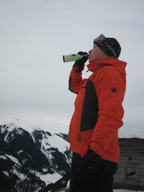Zum Warmmachen gings ein Stück flachen Forstweg talein, auch die unteren Wiesenhänge waren noch gemütlich zu gehen. Richtig auf Betriebstemperatur kamen wir im steileren Hang unter der Steinbergalm. Wegen der etwas eisigen Aufstiegsspur waren Harscheisen angenehm - wer keine hatte, hat heute wohl leichten Muskelkater in den Oberarmen! Und nach ein paar Mal "da nächste Buckel miaßats jetz sei" haben wir den Gipfel dann doch noch erreicht! Etwas zugig wars dort oben, aber keine Klagen: das angekündigte Schlechtwetter (es war in der Ferne zu sehn) hat brav gewartet bis wir wieder unten waren. Und die Gipfelbrotzeit haben wir halt vor der Almhütte gemacht. Übrigens mit Sekttaufe für Toschi's ersten Skigipfel!
