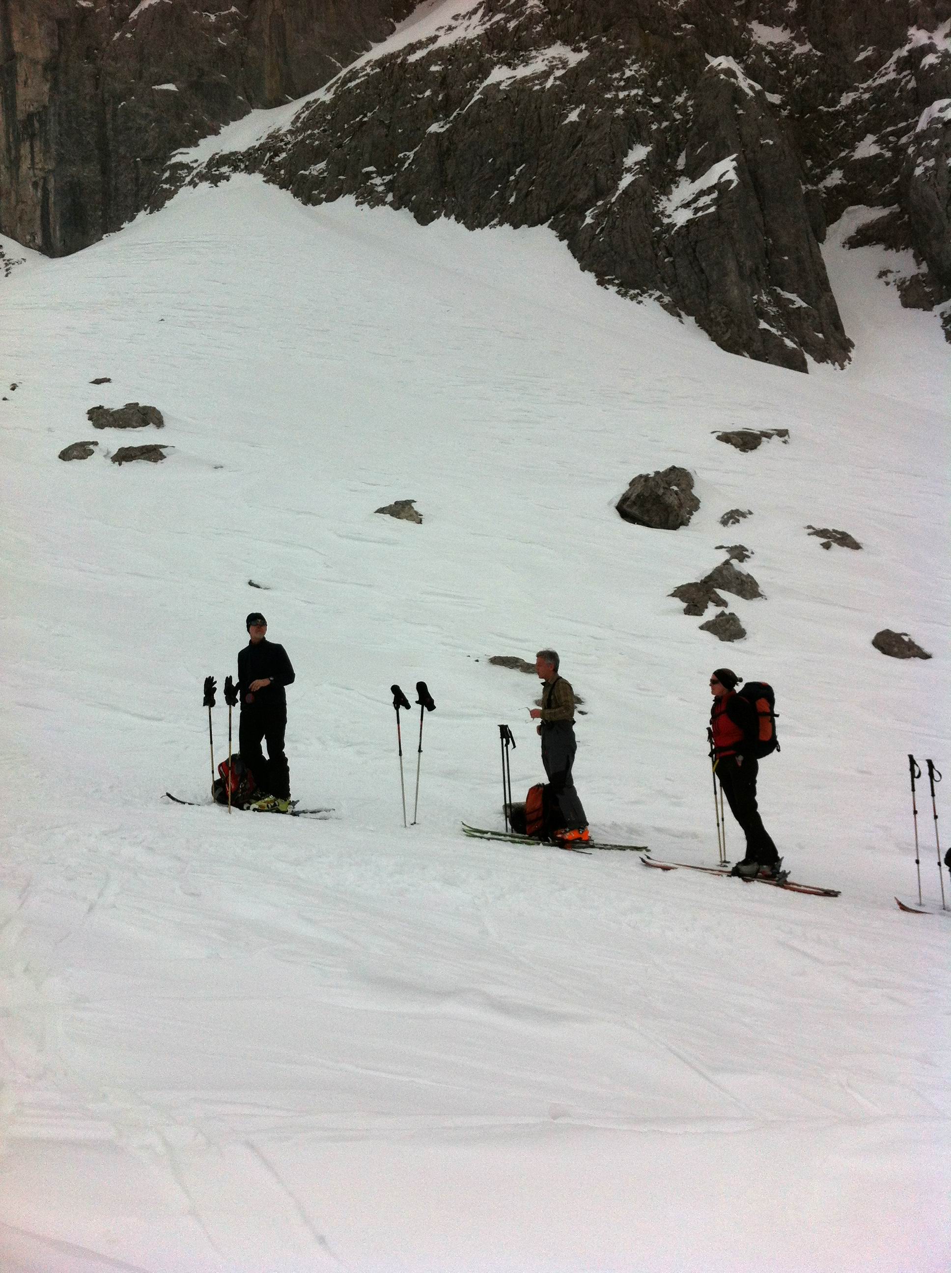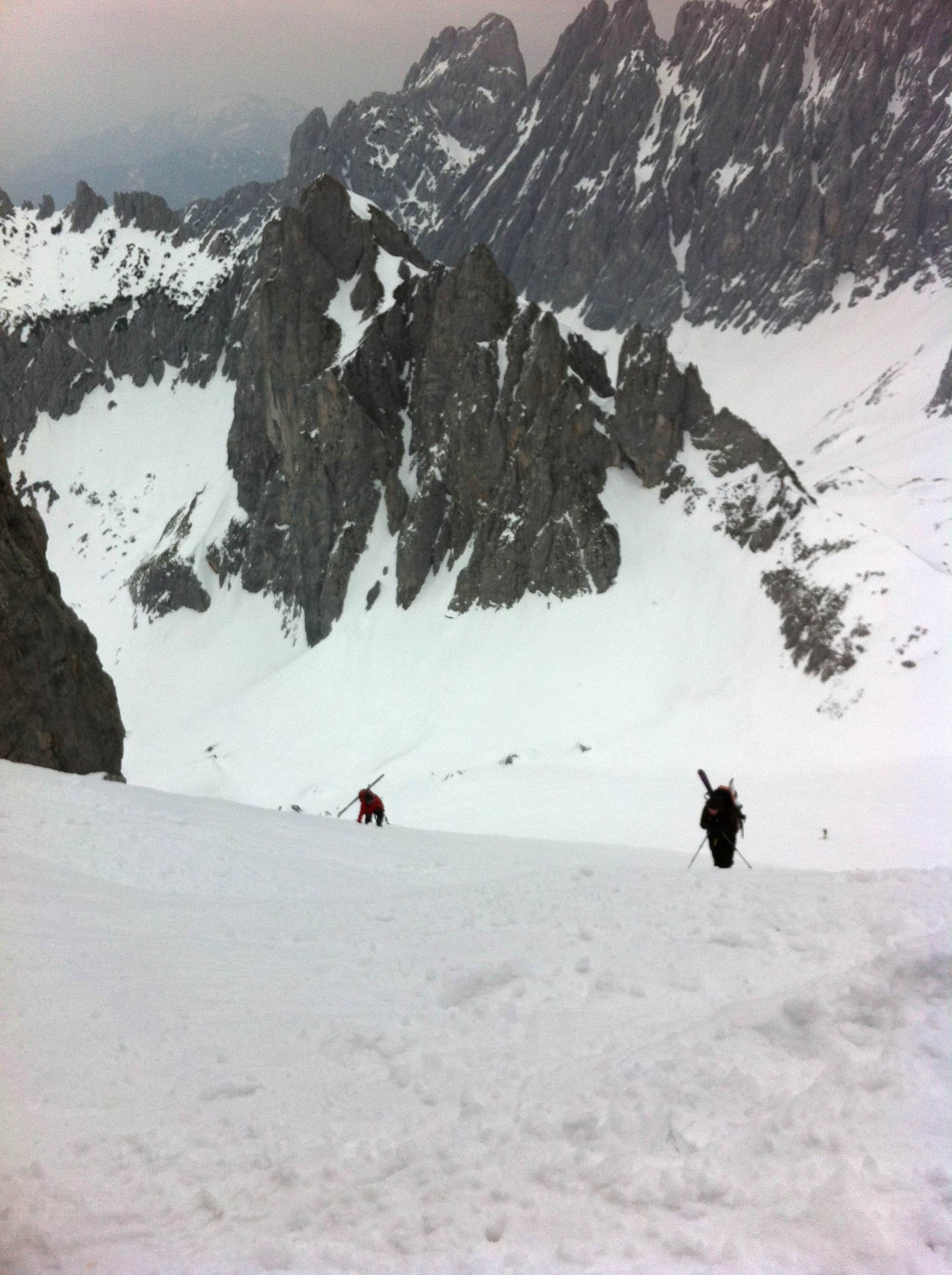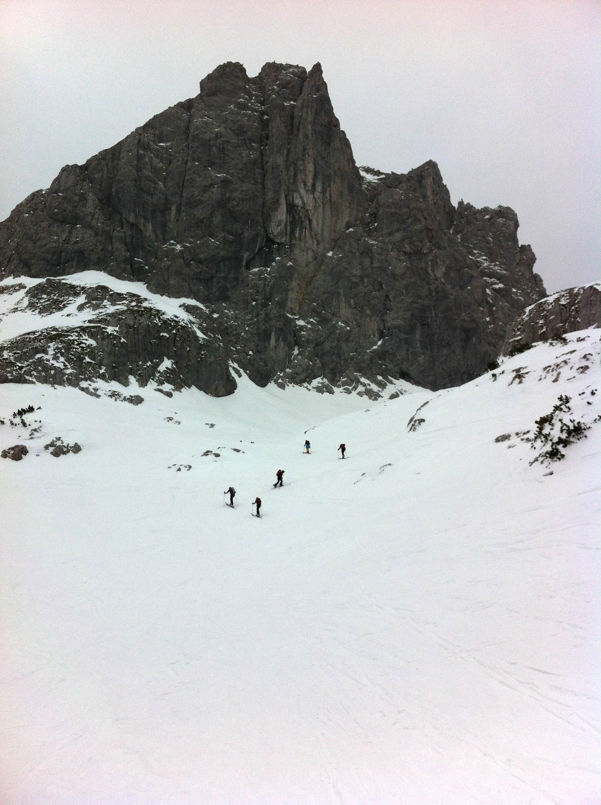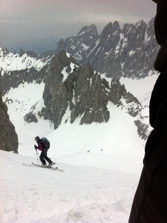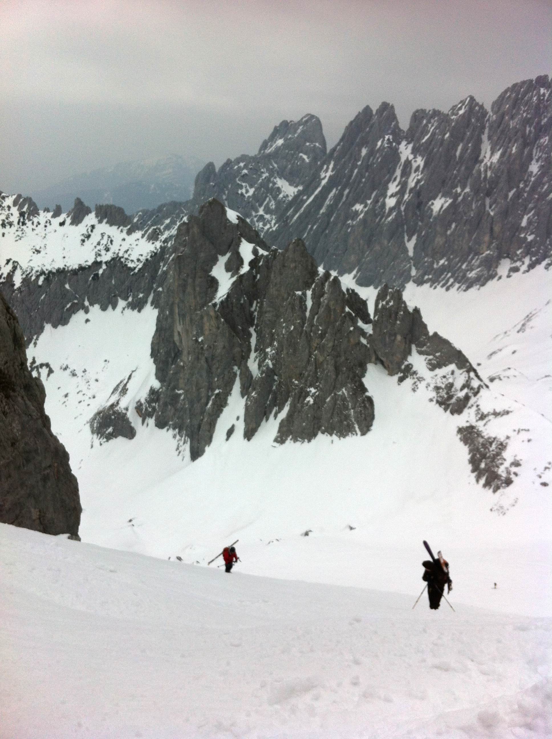 Einer der großen Klassiker im Wilden Kaiser - diese Tour durch die spektakulär zerklüftete Felslandschaft im Kaisergebirge bietet oft Firn bis spät ins Frühjahr. Die Harscheisen waren am Ende nicht verkehrt.