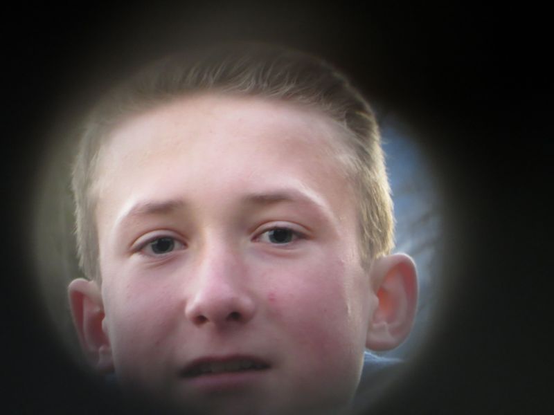 sitzt oana mit lange schwarze Hoor und dreckigem Lodn.