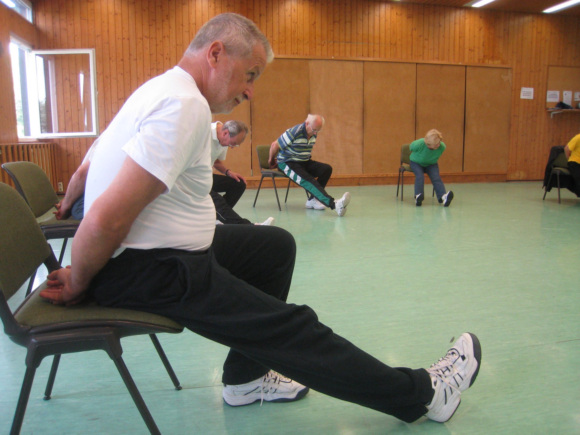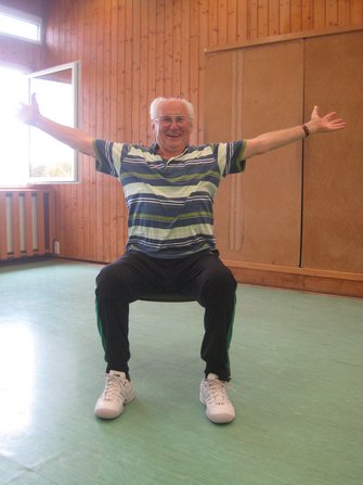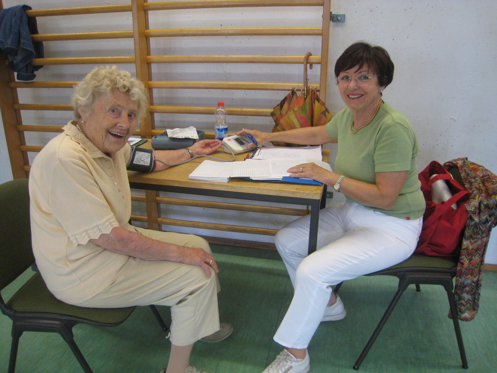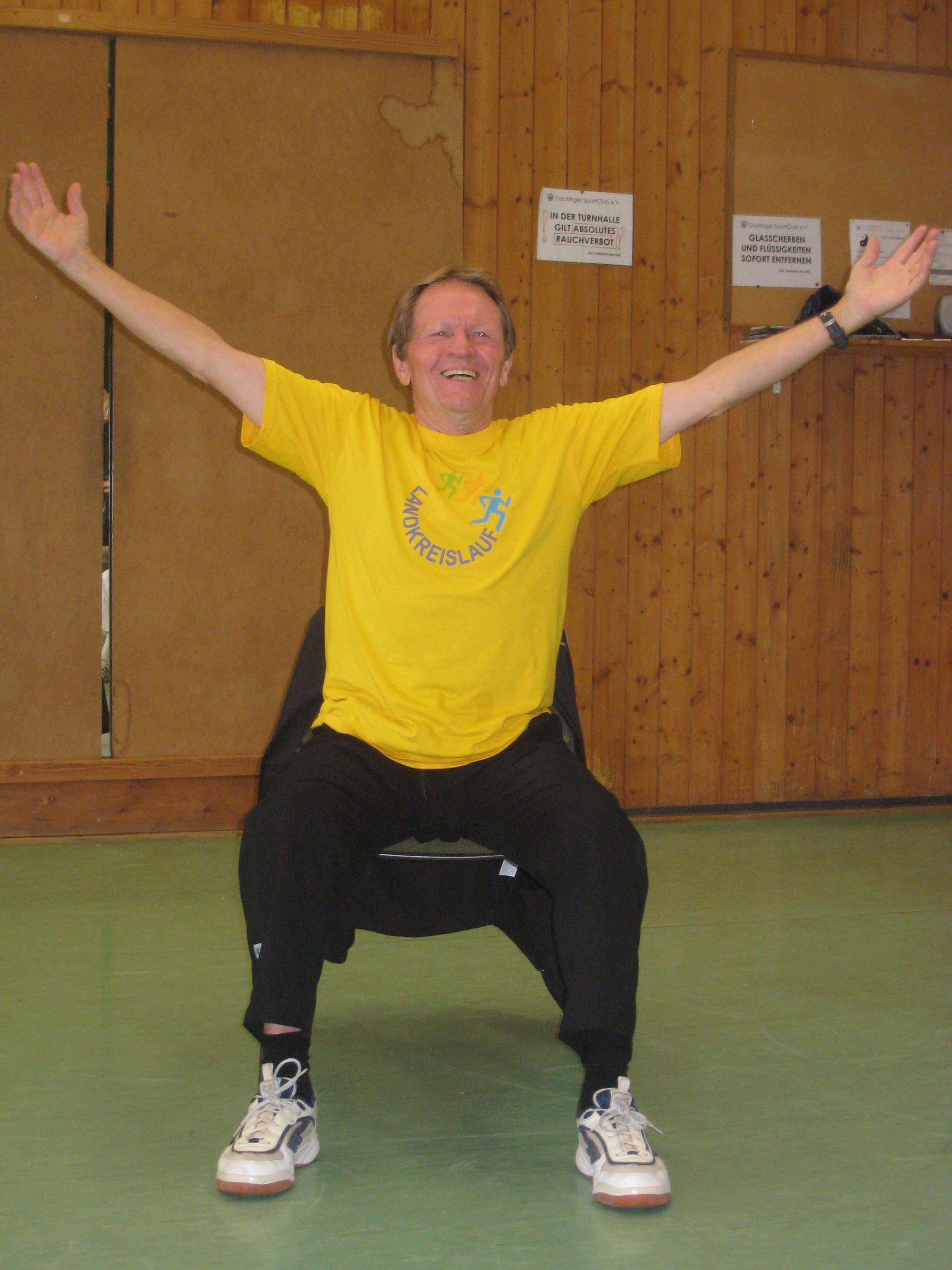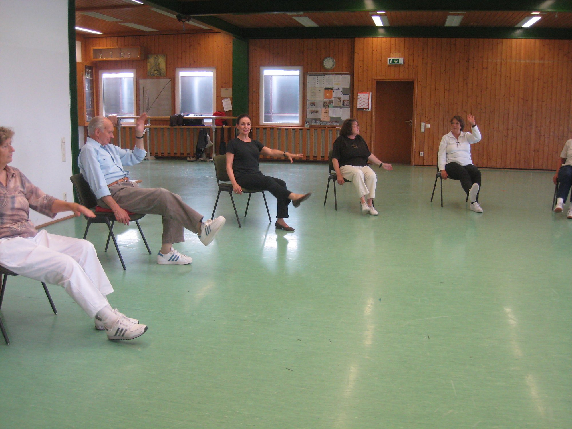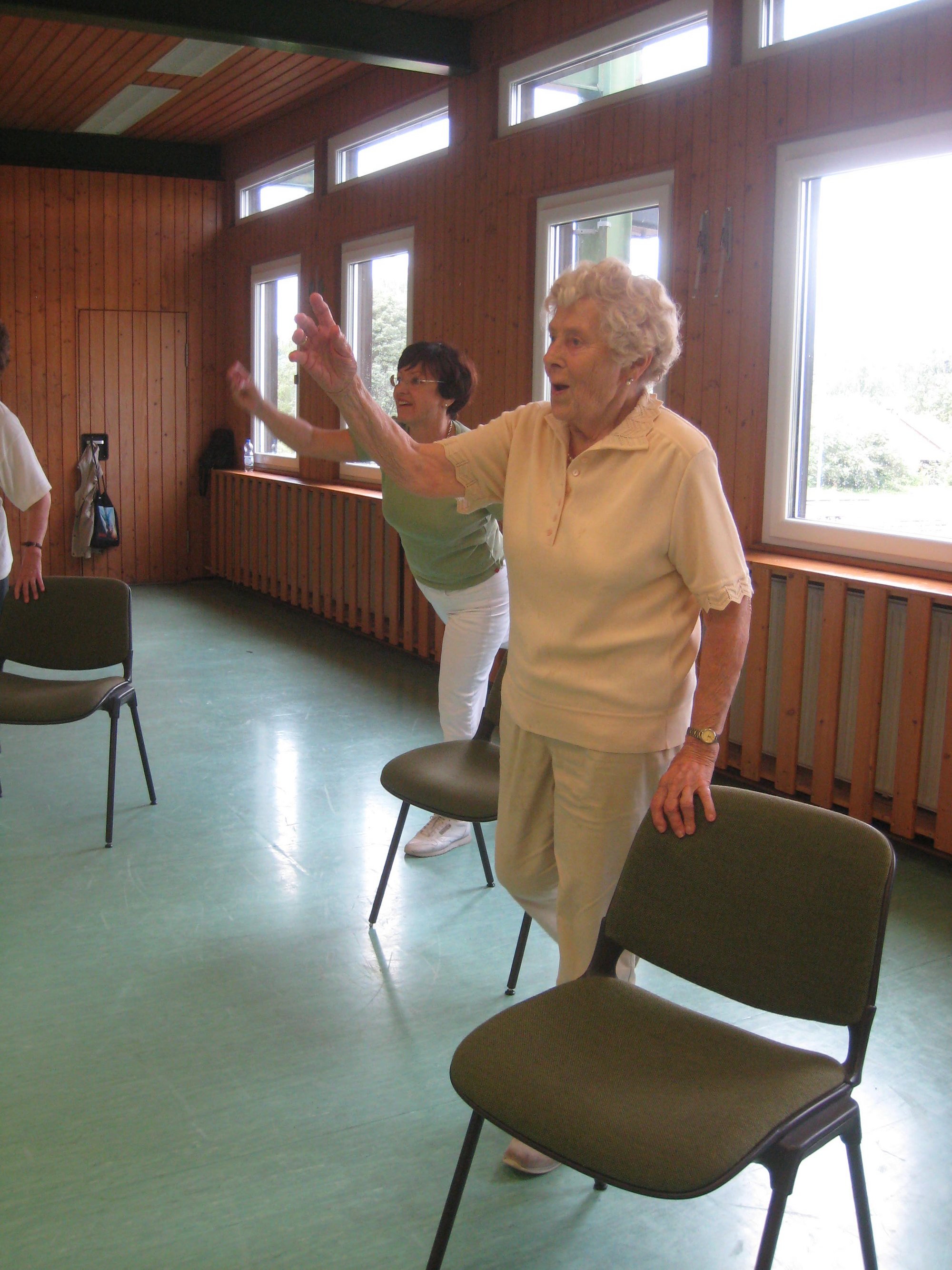 Herzsportgruppe Check, dann geht's los! Schwungvolles Aufwärmen Was sagt der Puls dazu? Schwitzen im Sitzen... So sieht's beim Profi aus... Und Spaß macht's auch! Die 90 locker überschritten und sooo fit!!! Dehnen muss sein