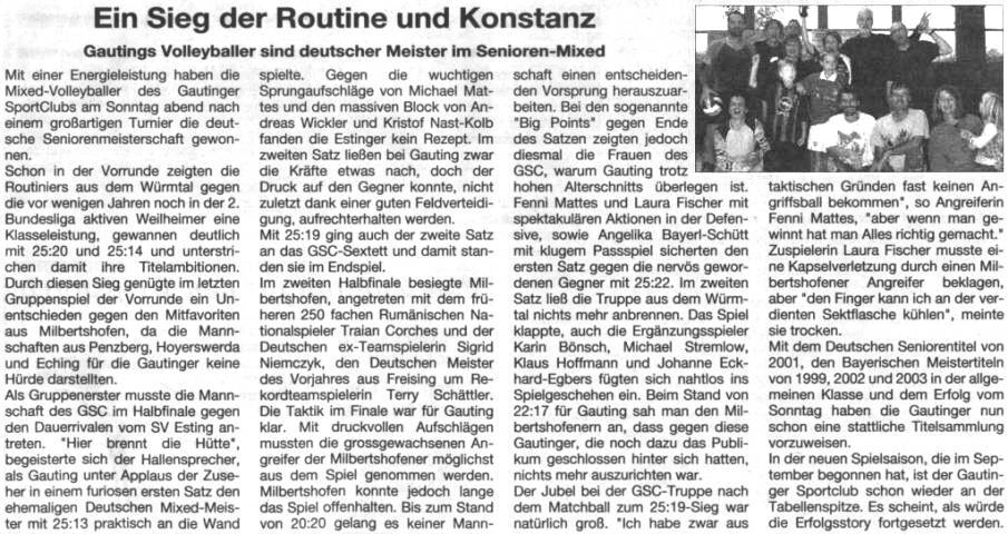 Deutscher Seniorenmeister ! Die Mixed-Volleyballer des Gautinger SC holten sich in Eching den zweiten deutschen Meistertitel bei den Senioren (Frauen Ü37, Männer Ü41) ab.