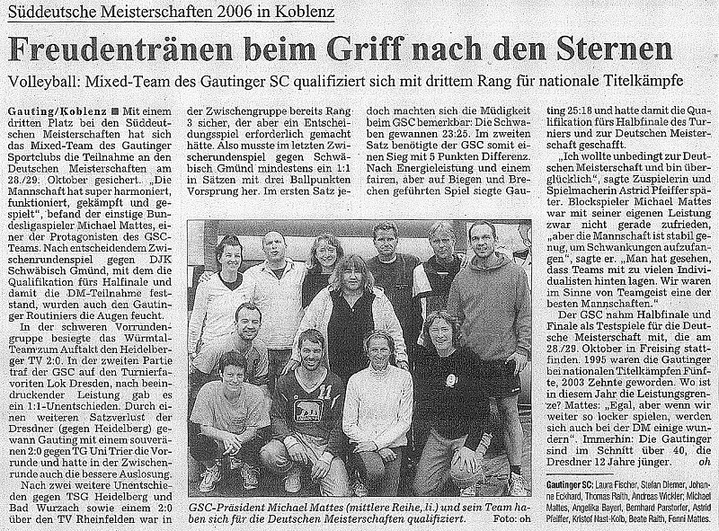 Die Ergebnisse und einen ausführlichen Bericht von der Süddeutschen Meisterschaft 2006 im Mixed-Volleyball gibt es im Archiv des Deutschen Volleyballverbandes.